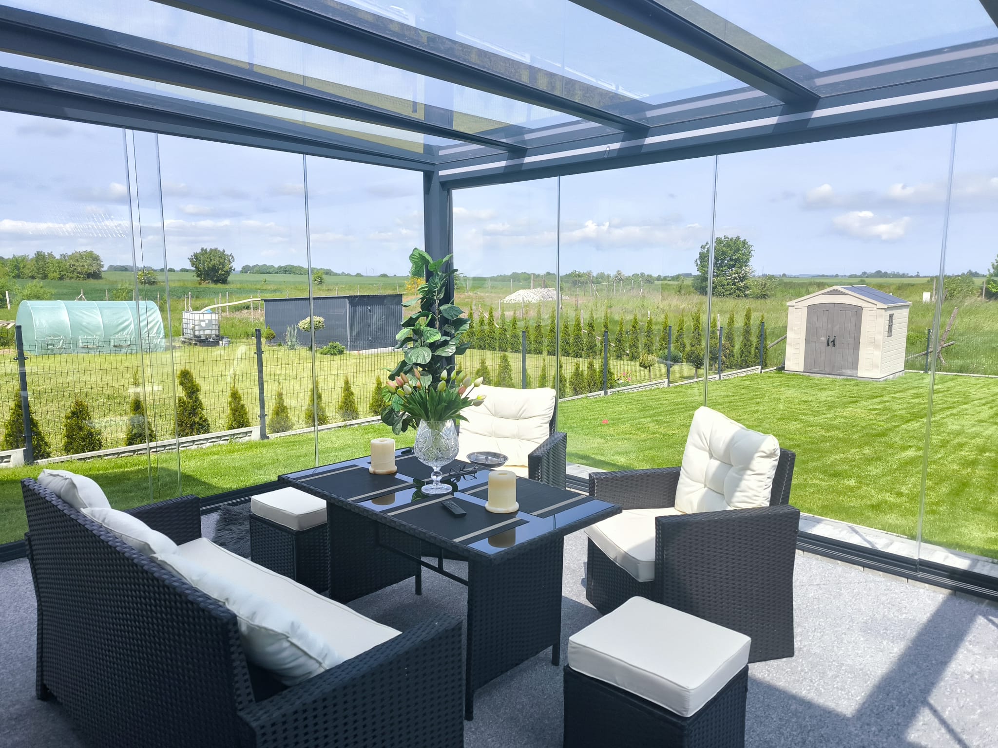 Szklany dach w połączeniu z delikatnym światłem LED tworzy wieczorami niepowtarzalny klimat – idealny na spotkania z bliskimi, kolację pod gwiazdami czy chwilę relaksu z ulubioną książką.
